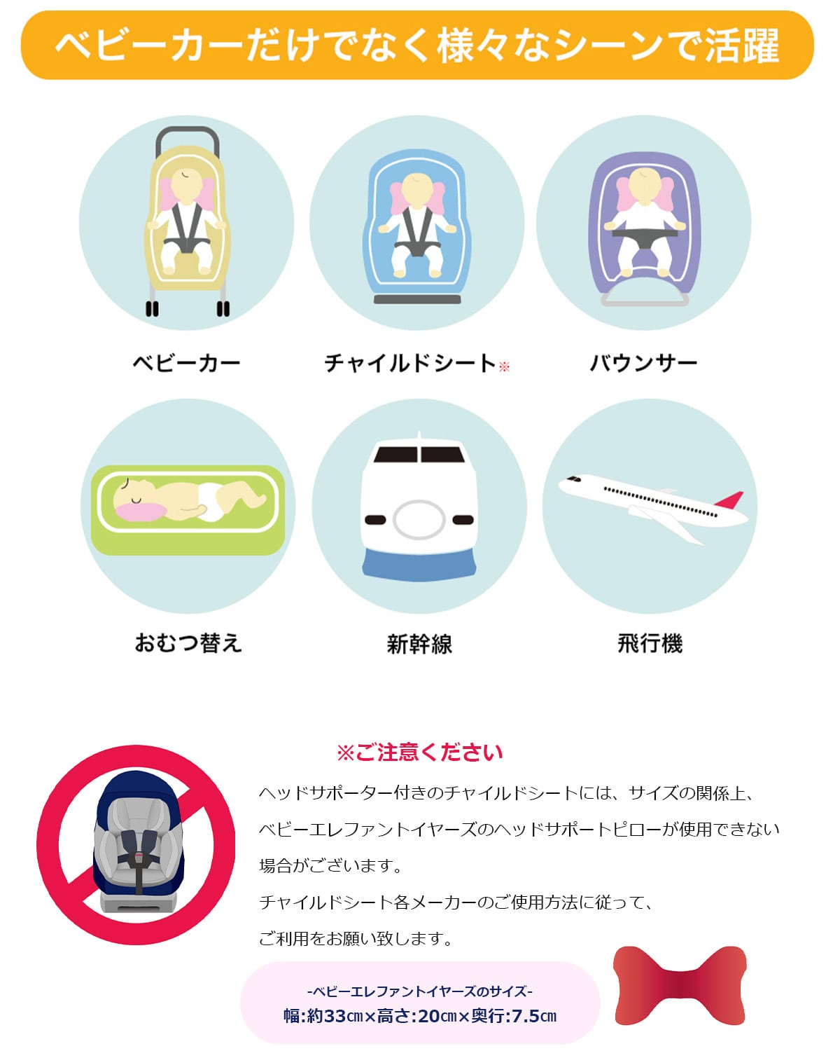 「ベビーエレファントイヤーズ」は、新生児や首すわり前の赤ちゃんからご使用いただけるよう開発されたネックサポートアクセサリーです。